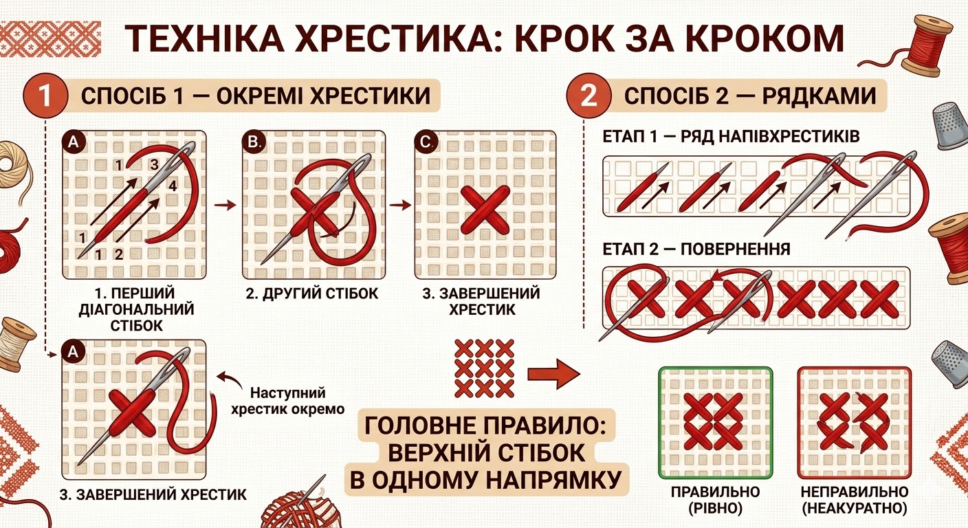 Головне правило: верхній стібок у всіх хрестиках має лежати в одному напрямку — тоді робота виглядатиме рівно і акуратно.